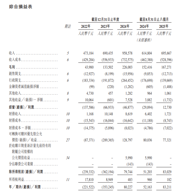 招股书显示,在过去的2022年、2023年、2024年和2025年前八个月,卓正医疗的营业收入分别为人民币4.73亿、6.90亿、9.59亿和6.96亿元,相应的净利润分别为人民币-2.22亿、-3.53亿、0.80亿和0.83亿元。
