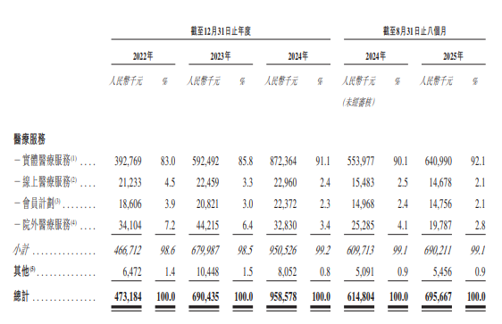 卓正医疗的收入主要来自向客户提供医疗服务(包括实体医疗服务、在线医疗服务、会员计划、院外医疗服务)、以及一些其他业务(主要包括在公司网上商城销售健康类产品)。