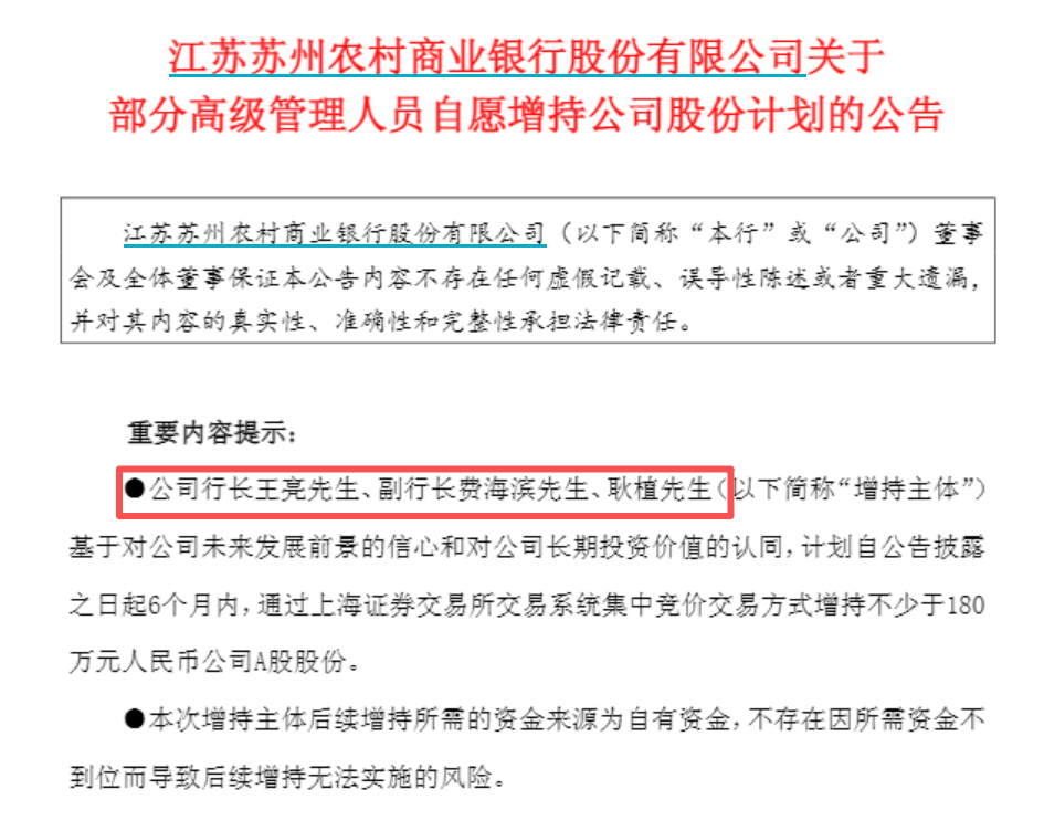 前几天刚获聘为行长的王亮和副行长的费海滨、耿植,计划增持苏农银行的股票不少于180万元。王亮、费海滨、耿植都是苏农银行新提拔的行领导,分别为1982年、1986年、1985年出生。