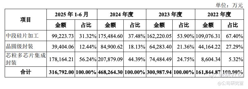 2022年至2025年上半年,硅片加工业务占比由67.4%下降至31.32%,晶圆级封装业务占比由27.29%下降至12.44%;芯粒多芯片集成封装业务占比由5.32%提升至56.24%