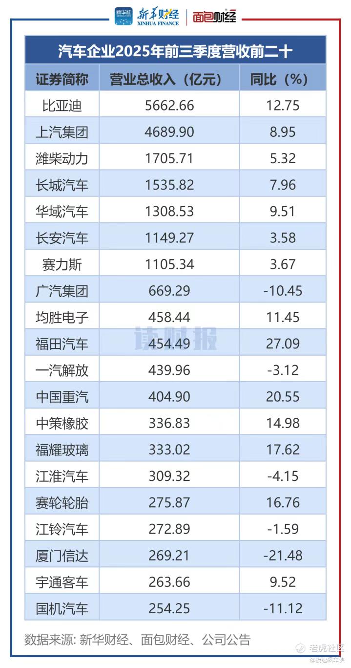 头部企业引领营收规模,比亚迪以5662.66亿元营收稳居榜首,同比增长12.75%;上汽集团、潍柴动力等6家企业营收超千亿元。增速方面,威帝股份、富特科技等3家公司营收翻倍,而上海物贸、索菱股份等企业收入降幅超30%,行业分化明显。
