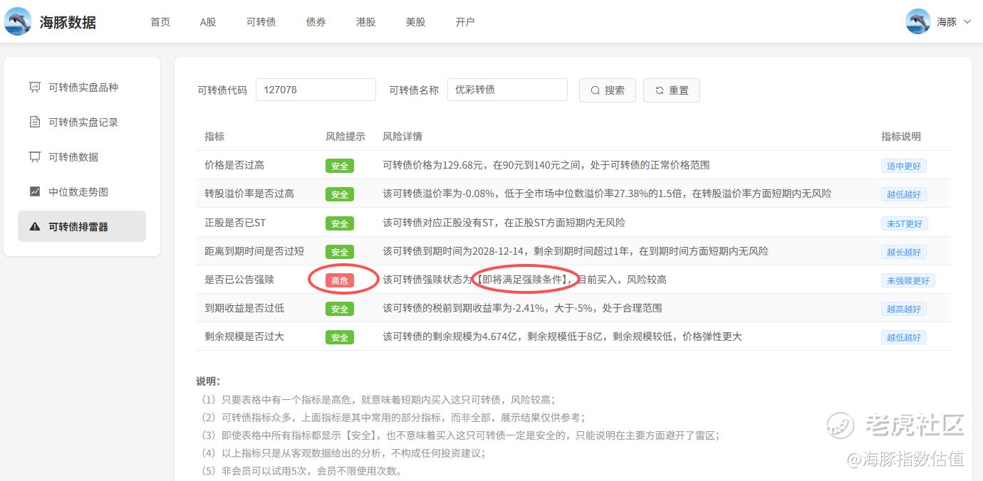今天把可转债排雷器升级了一下,只要可转债即将满足强赎条件,就标注为高危,这样可以避免参与即将满足强赎条件的可转债: