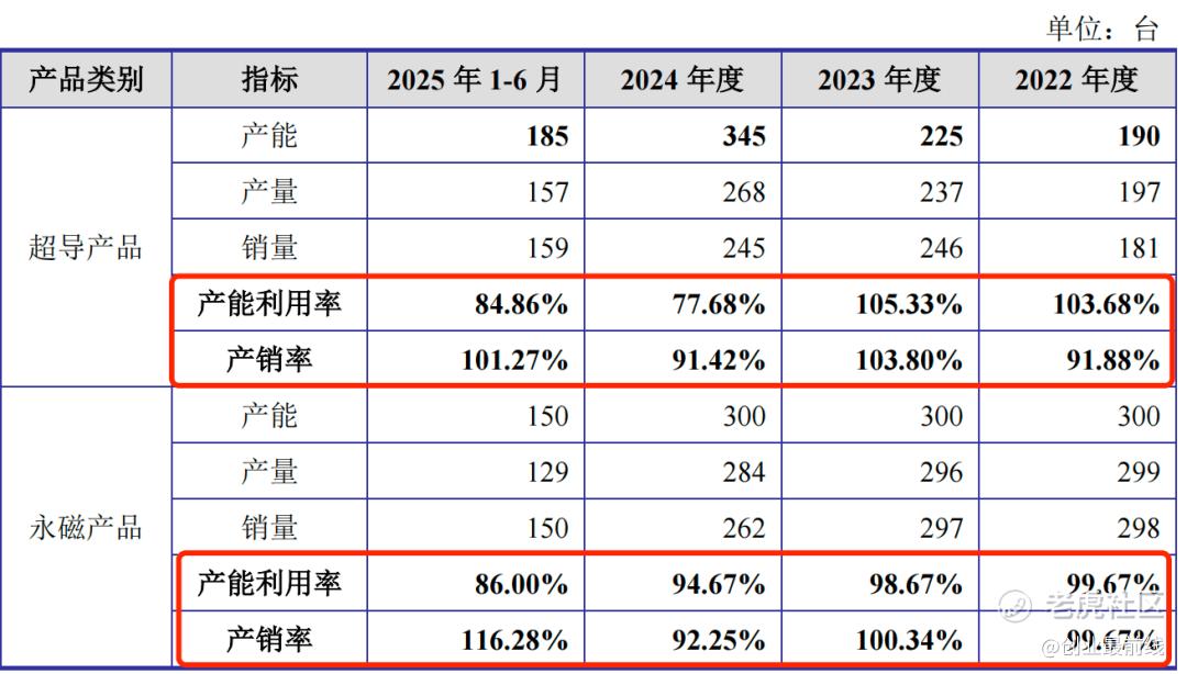 报告期内,公司超导产品的产能利用率分别为103.68%、105.33%、77.68%和84.86%;永磁产品的产能利用率分别为99.67%、98.67%、94.67%和86%,产能利用率有所下滑。