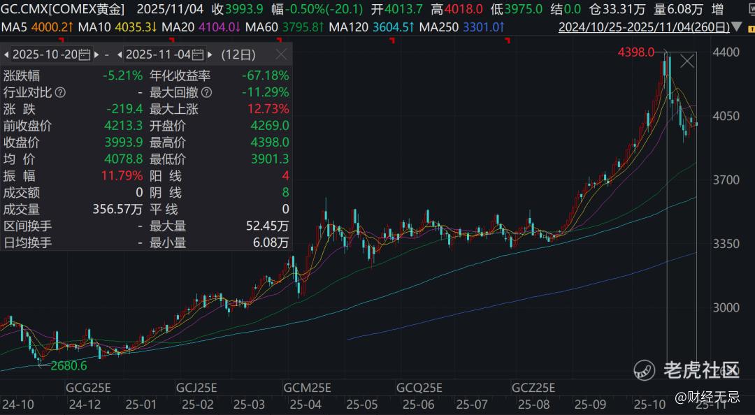 10月下旬以来,国际金价自历史高点回落,在4000元/克附近反复震荡;与此同时,美股科技板块因巨头三季报集体不及预期而承压下行。