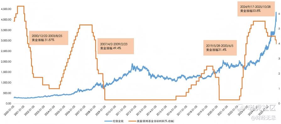 自2000年以来,美联储四轮降息周期均推动黄金资产实现显著增值,黄金ETF的长期配置逻辑随之不断强化。