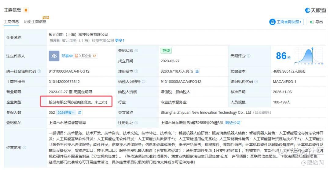 值得注意的是,昨日,智元机器人关联公司智元创新(上海)科技有限公司正式更名为股份有限公司,企业类型变更为"港澳台投资、未上市"。这一工商变更距离其完成对上纬新材63.62%股权的收购仅过去4天,距离上纬新材股价启动点(8元)涨幅已达1229.95%,对应动态市盈率飙升至354倍。当市场还在争论这场科创板首例具身智能并购案是"科技创新"还是"资本炒作"时,智元机器人已带着腾讯、京东、比亚迪等豪华股东团,用21亿元现金完成了一场教科书级的资本闪电战。