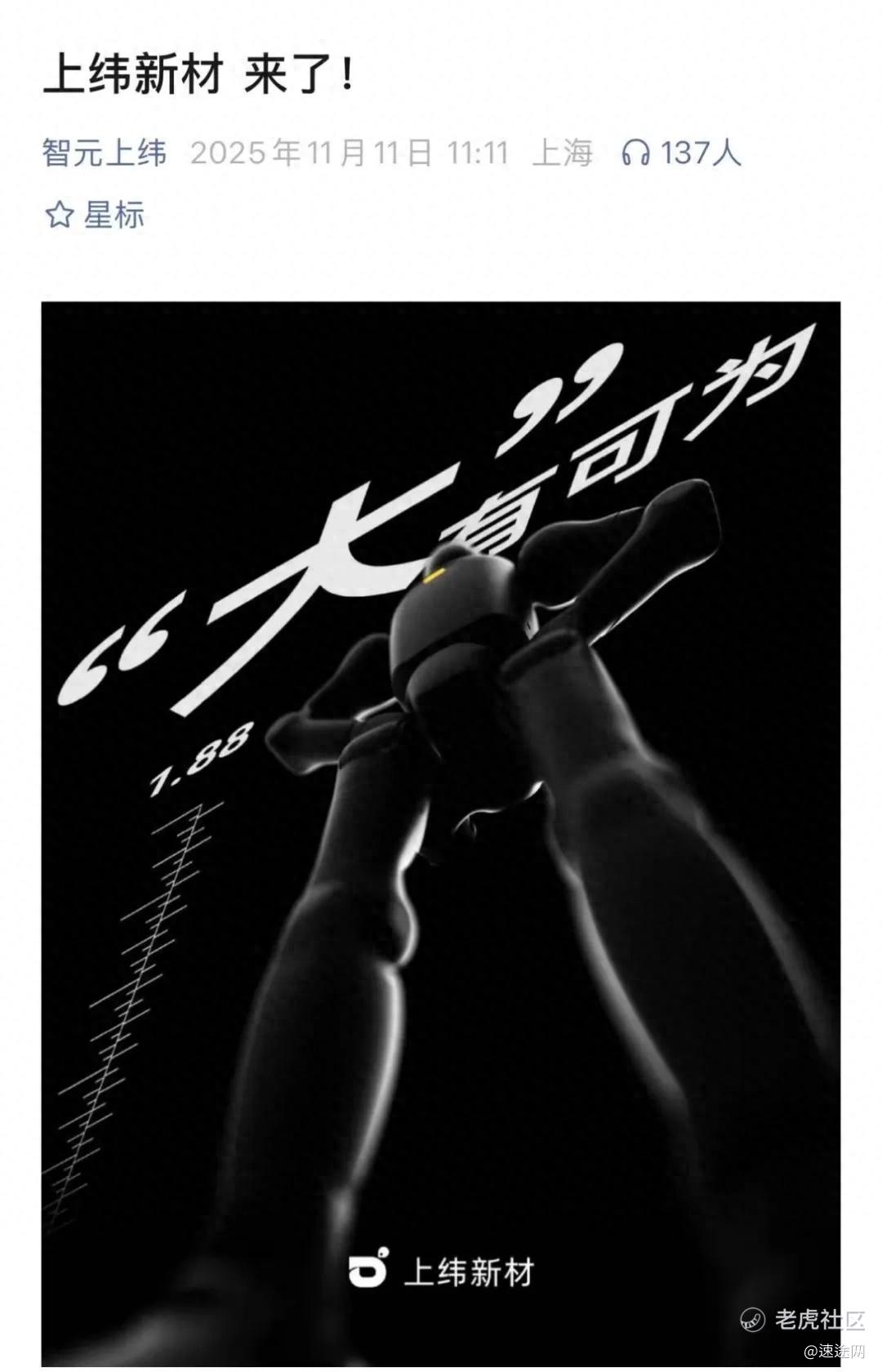 今日上午,速途网注意到,公众号名为“智元上纬”的账号发布了一条“上纬新材来了!”。该篇内容主要发布了两张印有“上纬新材”LOGO的机器人概念海报,分别是一张1.88高度的“大”有可为,以及敬观其“变”。该账号认证主体为“上纬新材料科技股份有限公司”。