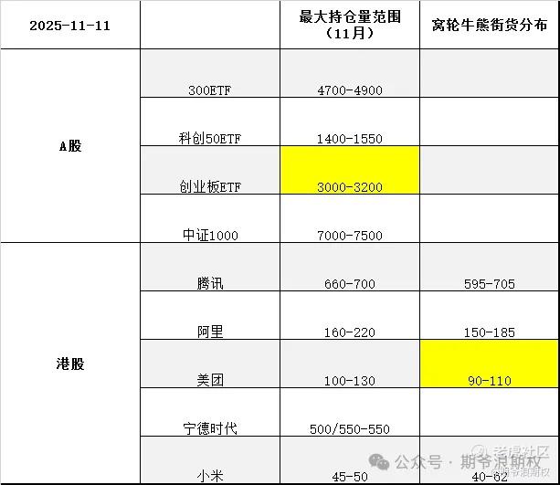 下图是今天大A的3个ETF和中证1000,以及港股的腾讯、阿里、美团、宁德和小米的最大持仓量范围以及窝轮牛熊分布范围,也就是11月的期权筹码分布,黄色的表示跟上个交易日有变动。
