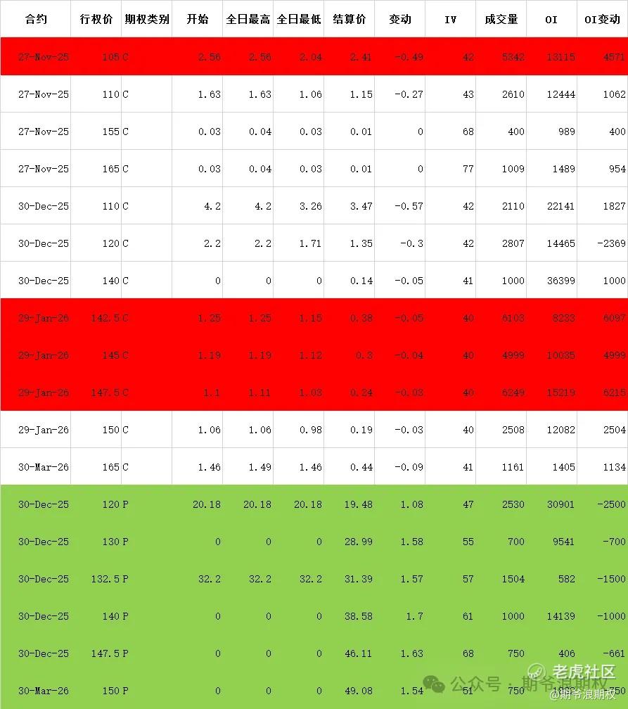 (3)美团:11月最大持仓范围100-130,窝轮牛熊街货分布90-110,今收102.0,下跌1.26%。期权盘路变化超过1000张的仓位如下,红色是增仓较大的,浅绿色是深度实值减仓。红色仓位,1月虚值购是最近第四次深度虚值购大增仓,前两次是12月的,后两次是1月的。有大佬持续加仓,看好美团在1月之前会有个比较不错的反弹。与此同时,浅绿色的仓位,明显是之前看好美团,愿意用深度虚值沽来随时准备买入美团股票的仓位,这些资金今天跑路了一部分。今天有看多加仓,也有不看好跑路的。