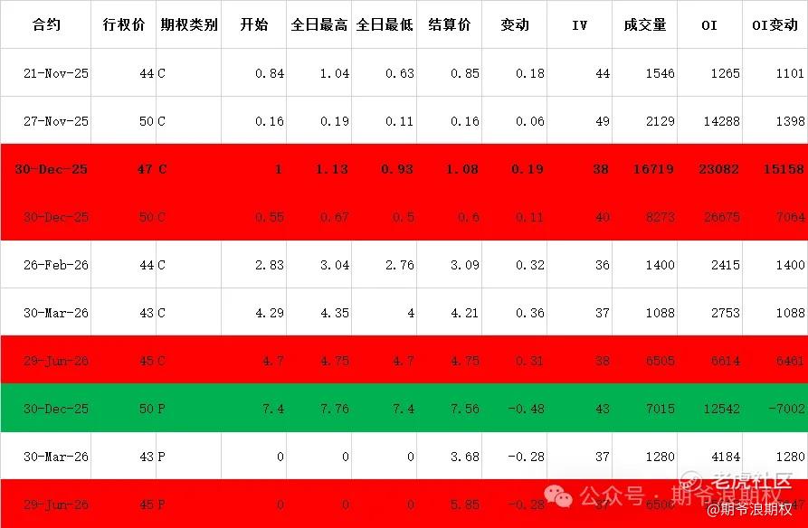 (5)小米:11月最大持仓范围45-55,窝轮牛熊街货分布40-62,今收42.98,上涨1.46%。期权盘路变化超过1000张的仓位如下,红色是增仓较大的,绿色是减仓较大的。12月的47购大增1.5W张,主动方更像是备兑。总的来说,市场对于小米近期还是看窄幅震荡。