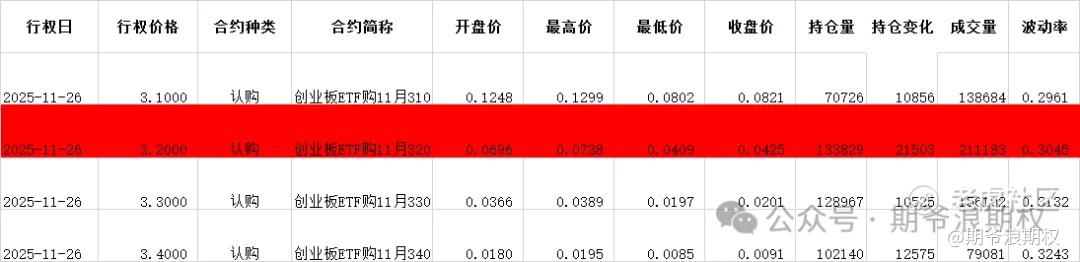 (3)创业板ETF期权:11月最大持仓范围3000-3200,今收3.113,下跌1.42%。期权11月主力合约,认购和认沽都是增仓为主。认购增仓集中在3000-3500,合计6.3W张;认沽增仓集中2700-3300,合计2.7W张。创业板ETF的期权仍然是最活跃的,多方在发力,但仍然有不少谨慎的仓位。变化超过1W张的仓位如下,红色是增仓较大的。