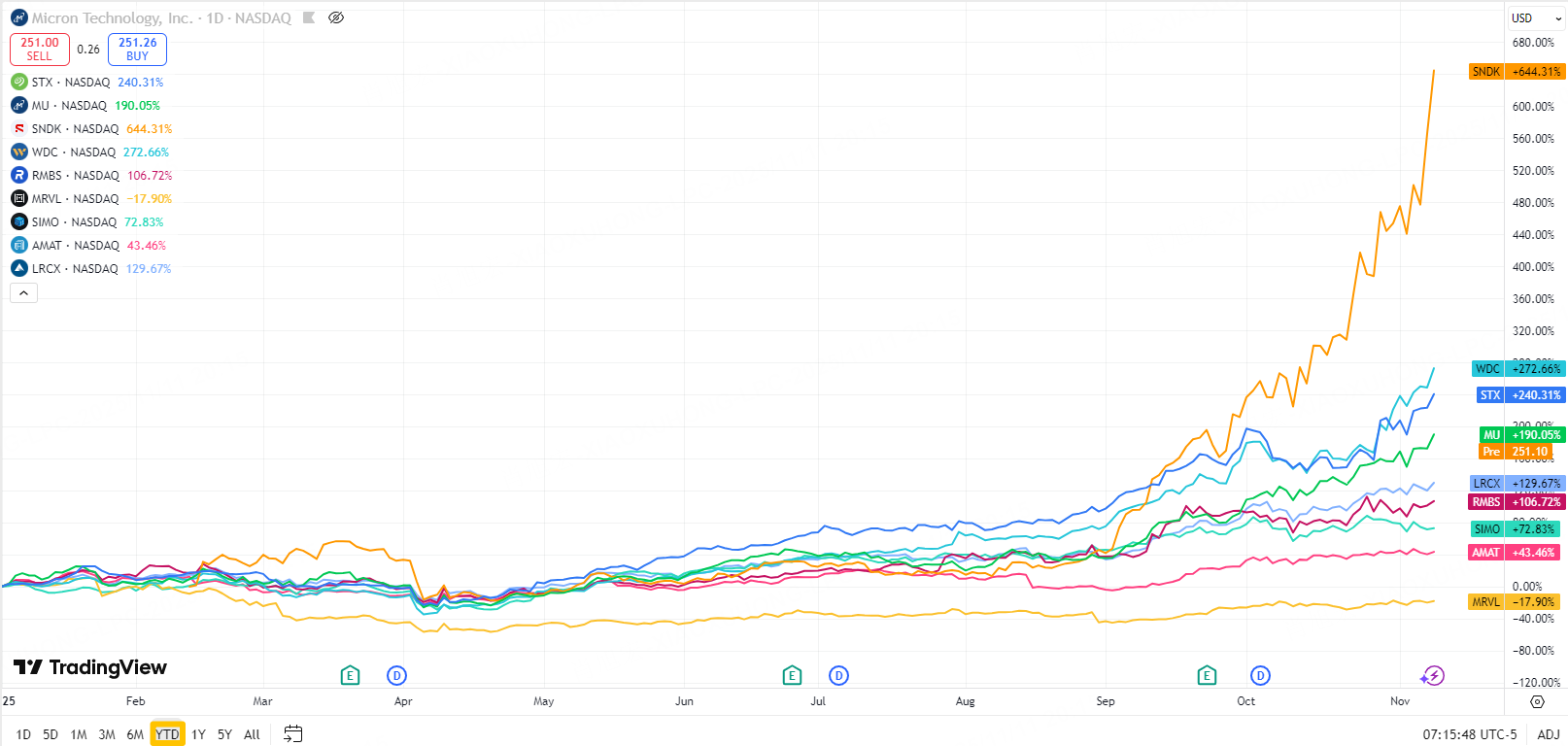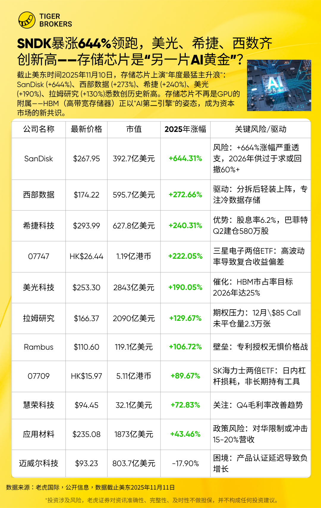 截止美东时间2025年11月10日,存储芯片上演"年度最猛主升浪":SanDisk (+644%)、西部数据 (+273%)、希捷 (+240%)、美光 (+190%)、拉姆研究 (+130%)悉数创历史新高。