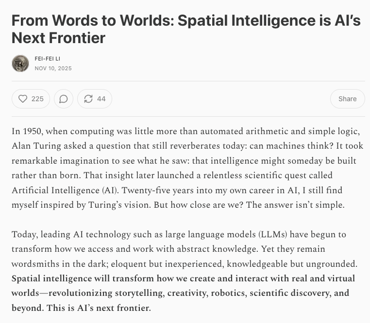《From Words to Worlds: Spatial Intelligence is AI’s Next Frontier》,图片来源:李飞飞博客