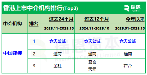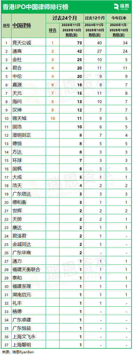 香港上市中介机构“IPO中国律师”排行榜:竞天公诚、通商、金杜、君合、中伦,排名前五 (截至202510)