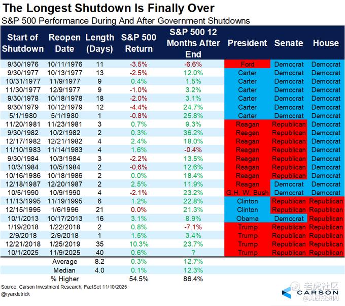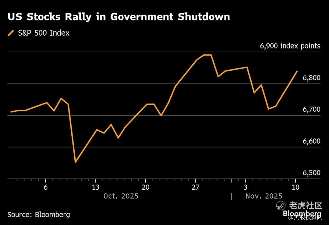 根据CFRA首席市场策略师Sam Stovall整理的数据,在此前15次美国Z府关门结束后的一个月里,标普500平均上涨2.3%。若本次也出现类似幅度涨幅,那么到12月中旬,标普500指数将逼近7000点。