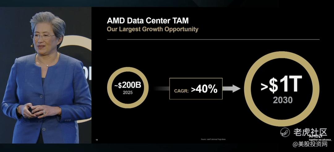 这一最新目标,较今年约2000亿美元的市场规模,复合年增长率(CAGR)将超过40%。这一惊人的数字,远超AMD自己此前的预期。就在今年6月,苏姿丰的预测还是“到2028年,AI处理器的市场规模将超过5000亿美元”。