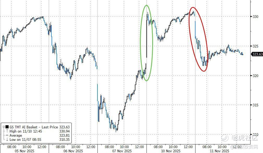 此外软银披露10月清仓 $英伟达(NVDA)$ 。 “大空头”Michael Burry 质疑人工智能公司的资产负债。科技股估值担忧引发相关股大幅下挫,AI一篮子股票指数抹去了昨日的大部分涨幅。