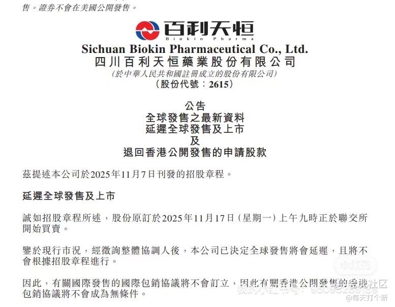 百利天恒延迟全球发售及上市!