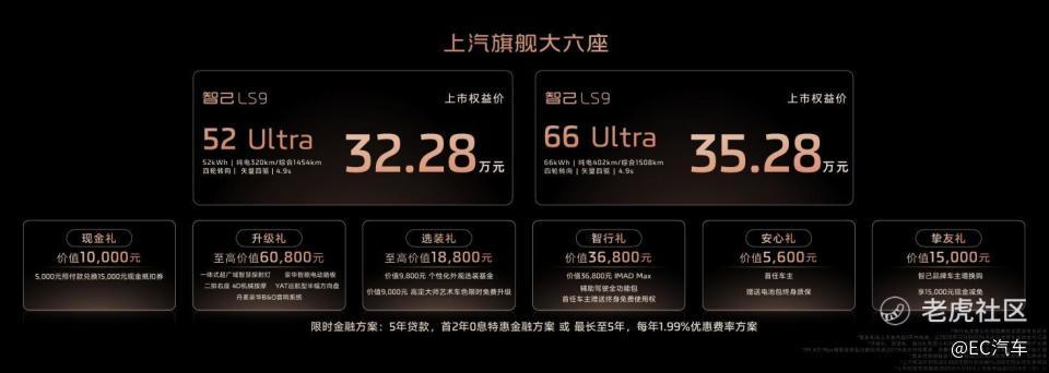 更震撼的是,智己LS9上市权益诚意爆棚,将奢华B&O音响系统、二排右侧4D机械按摩、一体式超广域智慧探射灯、豪华智能电动踏板等旗舰豪华配置,统统限时免费升级!新车震撼发布两个超级增程版本:智己LS9 52 Ultra版上市权益价32.28万元,入门即巅峰,以30万出头的价格,享受时代最旗舰的满配大六座;智己LS9 66 Ultra版,更搭载66度宁德时代超级骁遥MAX电池,将续航和性能推向极致,上市权益价35.28万元,一锤定音30万级最强旗舰爆品。