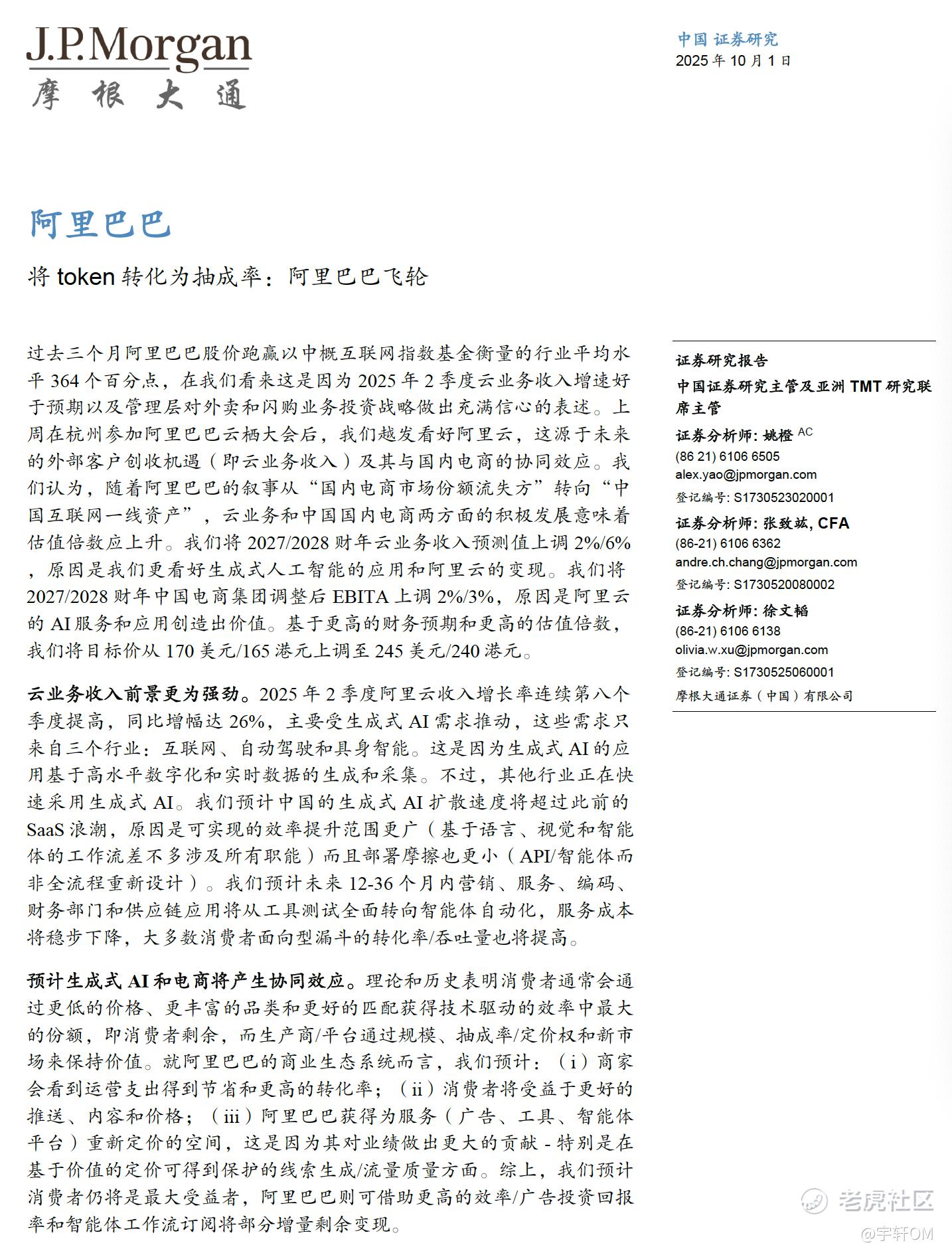 JPMorgan的明星分析师Alex Yao,最近用一个精妙的概念,概括了阿里的阳谋:“将Token转化为Take-Rate(抽成率)”。在JPMorgan看来,随着AI推动云业务变现、商家降本增效,阿里的叙事正从“电商市场份额流失者”转变为“中国AI互联网一线资产”。