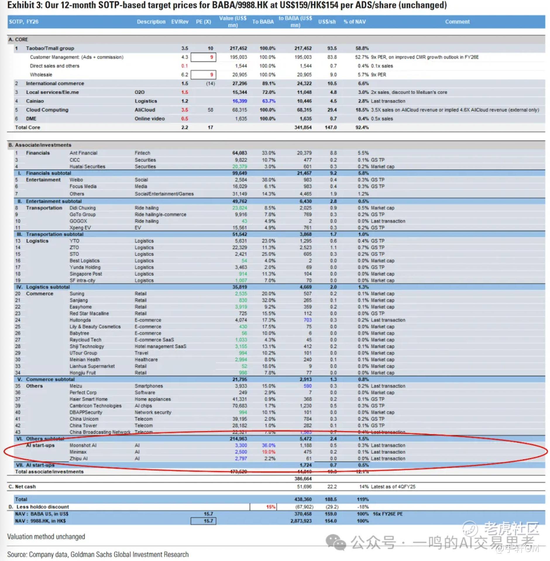除了本体之外,阿里还对外投资了月之暗面、Minimax、智谱等等大模型创业公司。在高盛的SOPT估值模型中,这些核心AI公司,已经计入了价值: