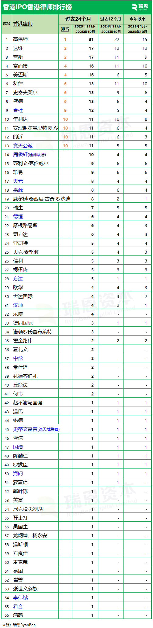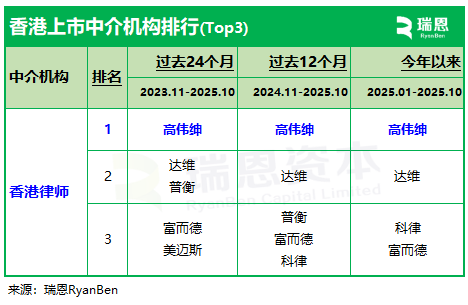 香港上市中介机构“IPO香港律师”排行榜:高伟绅、达维、普衡、富而德、美迈斯,排名前五 (截至202510)
