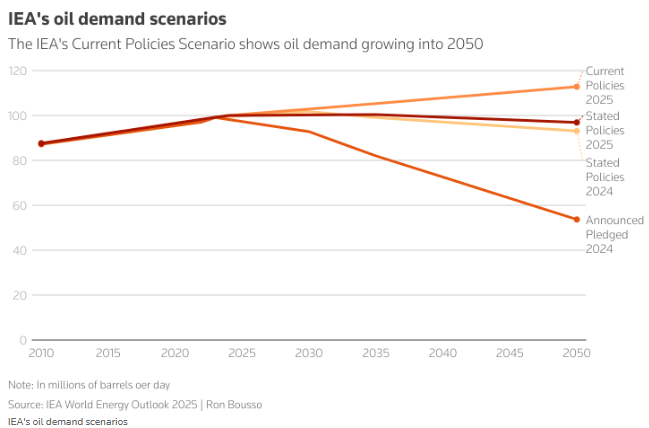 在周三发布的年度《世界能源展望》报告中,尽管国际能源署去年研究的三种情景都预计本十年石油需求将趋于平稳或下降,但最新报告重新引入了 “当前政策情景”(即 CPS),在这种情景下,到 2050 年石油消费量将较 2024 年增长 13% 至 1.13 亿桶 / 日。这种更为乐观的前景取决于电动汽车普及速度放缓。