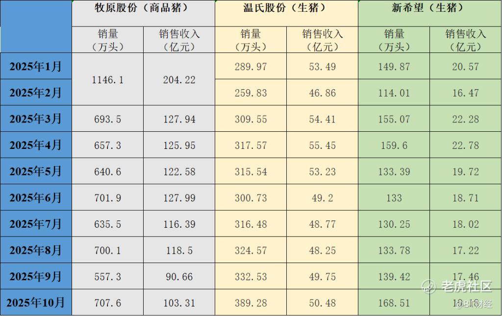 目前牧原股份、温氏股份和新希望是国内生猪行业的前三强。今年10月牧原股份生猪销量707.6万头,高于温氏股份389.28万头和新希望168.51万头的销量之和。从销量来看,三大上市猪企生猪销量环比同比均增长。牧原股份销量同比增长13.17%。温氏股份销量同比增长45.69%。新希望销量同比增长34.44%。