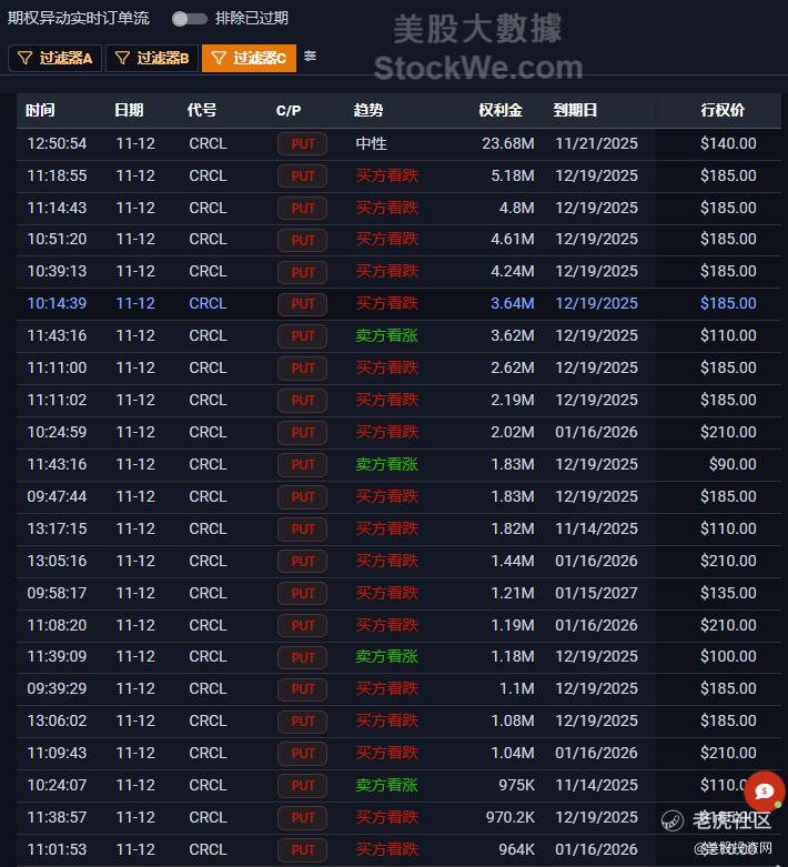稳定币CRCL 公布超预期财报后,不涨反而大跌,机构做空,几百上千万美元的看跌期权put