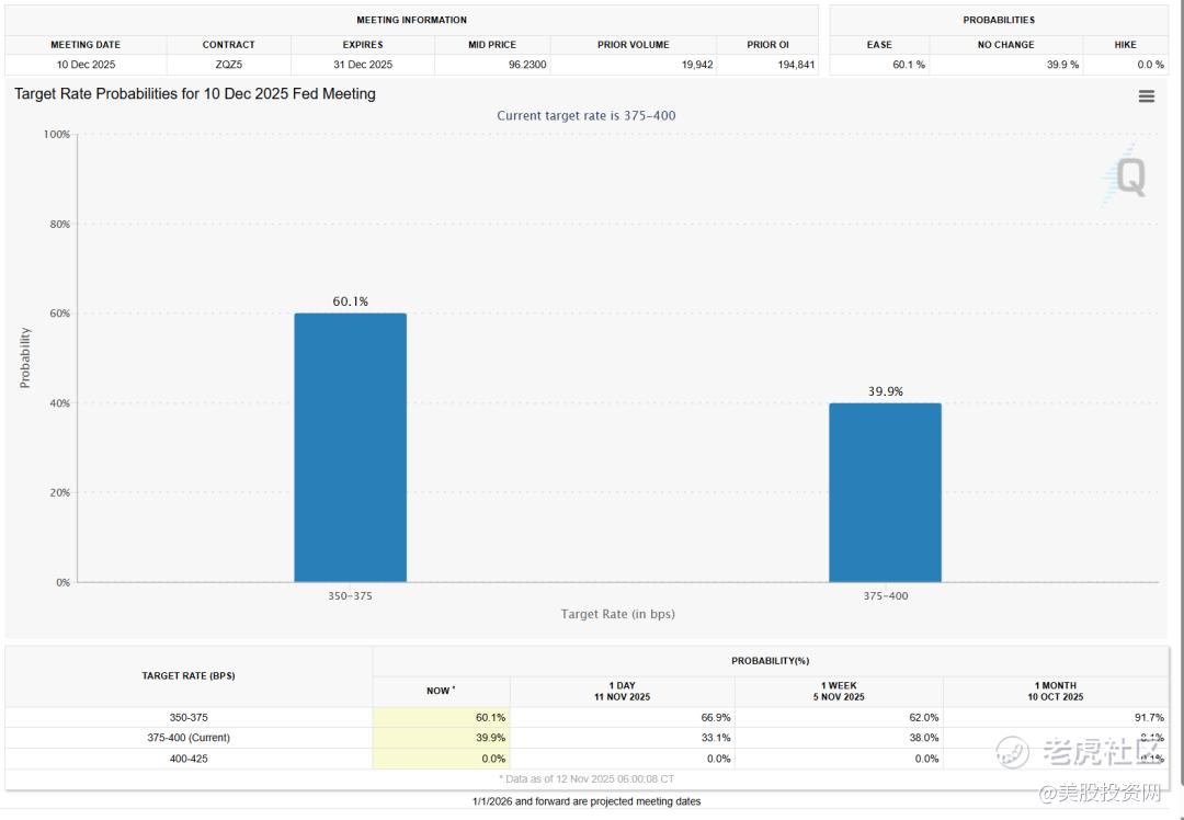 尽管消费者健康状况和裁员潮的担忧不无道理,但Ohsung Kwon认为,这些正是可能促使美联储在下个月启动降息的关键因素。当前利率期货显示,12月降息的概率仅为60.1%,如果届时降息如期落地,这一“预期差”很可能推动市场上涨。