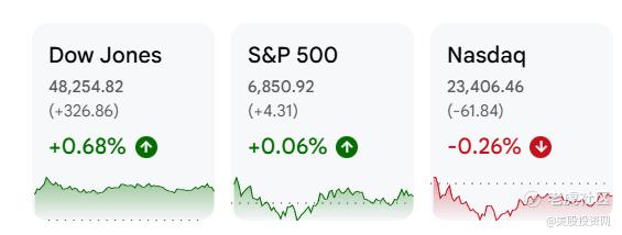 市场收盘时,道指在金融、医疗等板块的带动下强势上行,收涨0.68%,再创收盘历史新高。然而,罗素2000小盘股指数和以科技股为主的纳指则双双收跌。(道指涨、纳指跌,说明市场在做“防御性轮动”,投资者不再追逐风险最大的AI和高估值成长股,而是转向蓝筹和价值股。)
