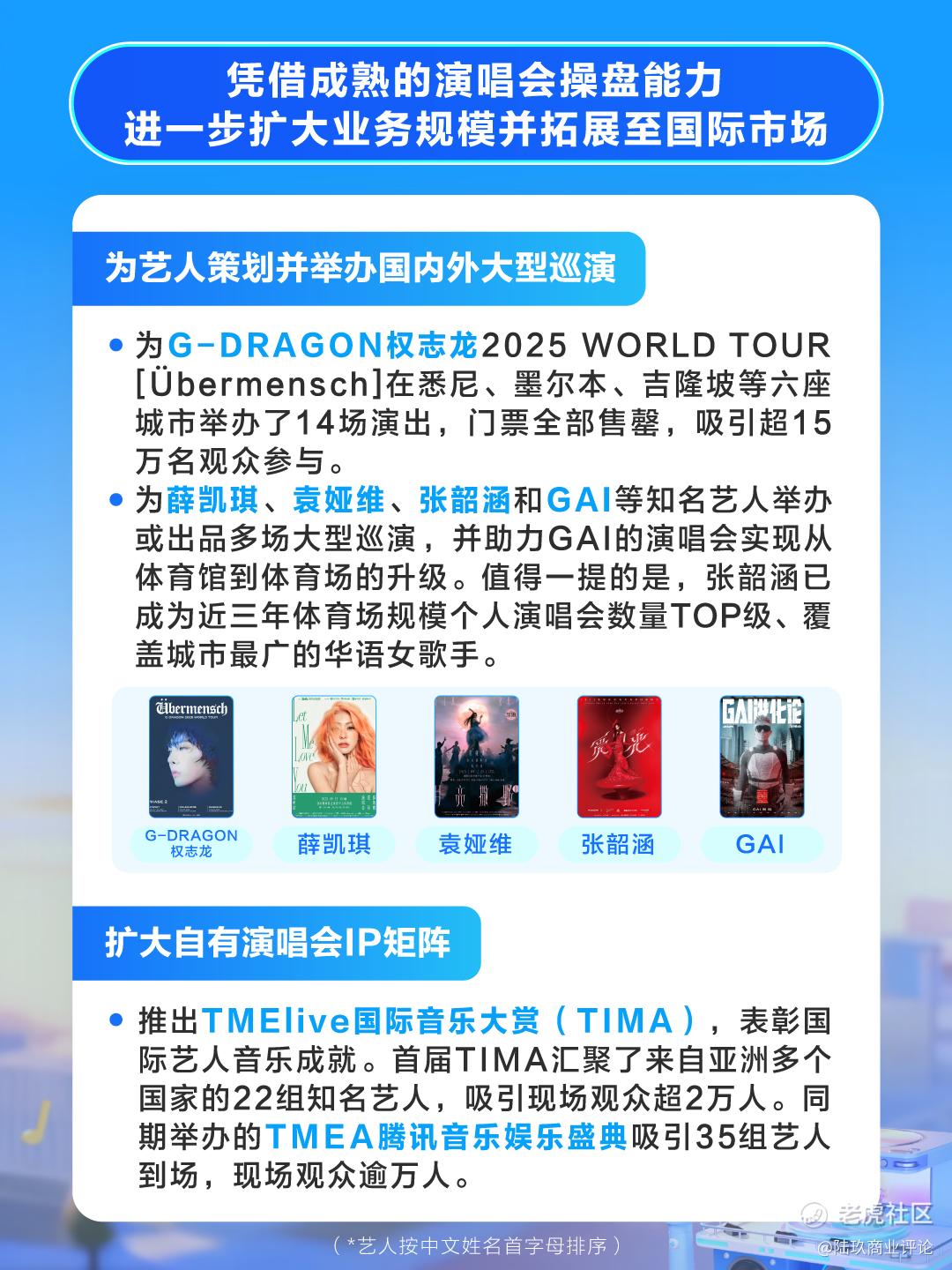 内容生态对腾讯音乐业绩增长的驱动作用持续凸显。本季度,腾讯音乐与G.E.M.邓紫棋、张杰、张艺兴等知名艺人续约,同时与暴雪娱乐、韩国厂牌DREAMUS、CEREAL、日本ACG厂牌KING RECORDS达成合作,持续拓展多流派、多语种音乐曲库;并积极探索创新的内容宣推方式,例如与腾讯游戏合作,联合天美工作室群策划《王者荣耀》十周年版本主题曲《明日坐标》,由易家扬作词、林俊杰作曲并演唱,歌曲上线两周登顶多平台音乐榜单。腾讯音乐也持续为国内外艺人策划并举办大型巡演,不仅继续举办G-DRAGON权志龙2025 WORLD TOUR [Übermensch]在悉尼、墨尔本、吉隆坡等六座城市的14场演出,还为薛凯琪、袁娅维、张韶涵和GAI等知名艺人举办或出品了多场大型巡演。此外,腾讯音乐继续扩充自有演唱会IP矩阵,本季度在中国澳门举办首届TMElive国际音乐大赏(TIMA),汇聚来自亚洲多个国家的22组知名艺人,为超2万名乐迷呈现了一场世界级音乐盛会。