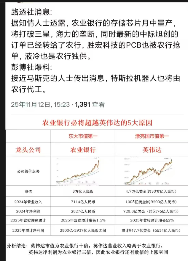 2 、中国股民是最诚实最好的股民,天天拿自己开心。农业银行 3 万亿,股民段子说农业银行变成了“存储”第一股,存钱储钱,所以可以对标“三星”“海力士” 了。笑死。