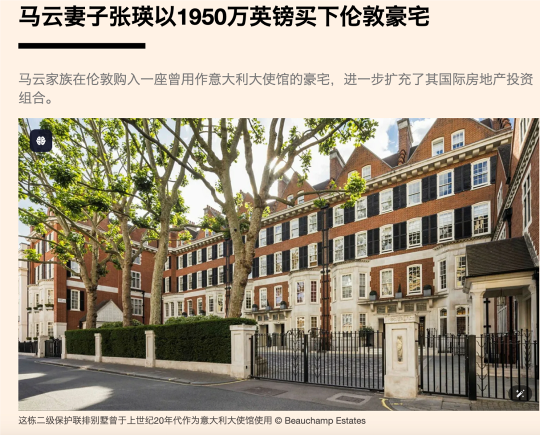 马云以妻子名义以1959 万英镑买下伦敦豪宅 阿里巴巴高管全球置业!