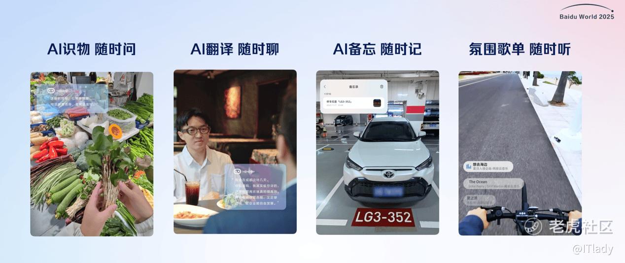 · AI识物:用户可以通过小度AI眼镜,准确识别物体信息的基础上,结合上下文提供智能回答建议,比如你前后询问了不同的蔬菜,超能小度还会主动提供蔬菜挑选、菜品搭配的建议。