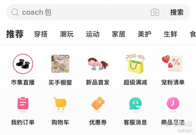 其将原本是“热门”的底部一级入口,更改为“市集”,点进页面可以找到直播、买手橱窗、新品首发等频道,与社区内容一样,将推荐商品设置为了双列浏览,与淘宝首页的推荐页面较为相似。