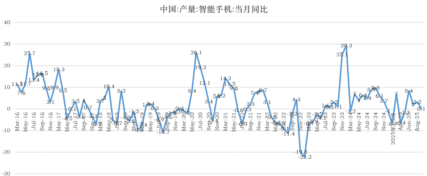 来自手机端的下滑与市场的疲软有关,根据统计局的数据,今年智能手机产量表现不佳,三季度相比二季度略有好转: