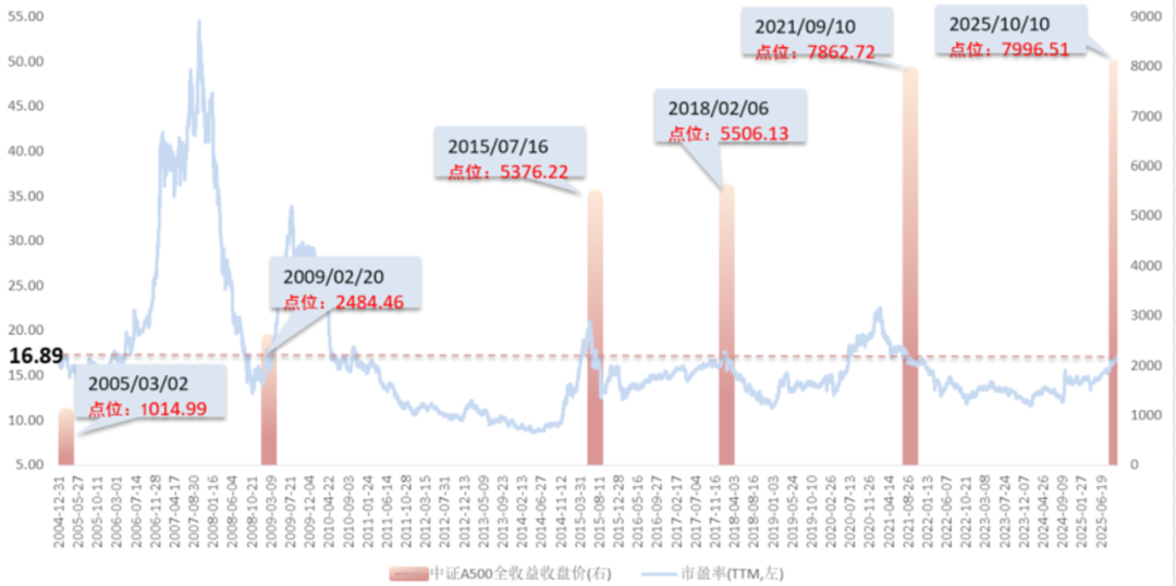 数据来源:Wind,时间区间:2004/12/31-2025/10/10,中证A500全收益指数(000510CNY010.CSI)2020年-2024年每年涨跌幅为+33.60%、+2.15%、-20.95%、-9.40%、+16.06%。2025/10/10市盈率为16.89,历史上与该市盈率接近的交易日及其市盈率分别为:2005/3/2市盈率16.9、2009/2/20市盈率16.9、2015/7/16市盈率16.89、2018/2/6市盈率16.9、2021/9/10市盈率16.89,以上数据为指数历史数据在特定情境下模拟结果,不代表指数实际业绩表现,不代表指数未来表现。