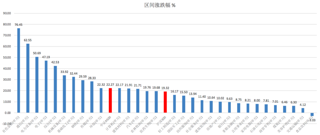 我们以市场表征性最强的沪深300和中证A500为宽基代表,与31个申万一级行业做了个涨跌幅对比。