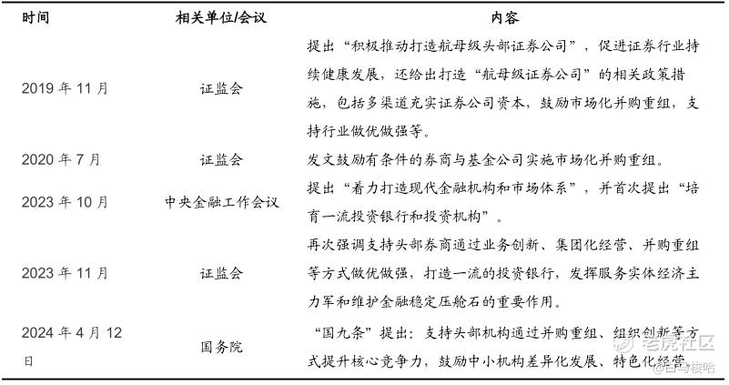背后一部分原因是政策驱动。2023年11月,证监会强调支持头部证券公司通过业务创新、集团化经营、并购重组等方式做优做强,打造一流的投资银行,发挥服务实体经济主力军和维护金融稳定压舱石的重要作用。2024年4月,《国务院关于加强监管防范风险推动资本市场高质量发展的若干意见》中进一步强调,支持头部机构通过并购重组、组织创新等方式提升核心竞争力,鼓励中小机构差异化发展、特色化经营。