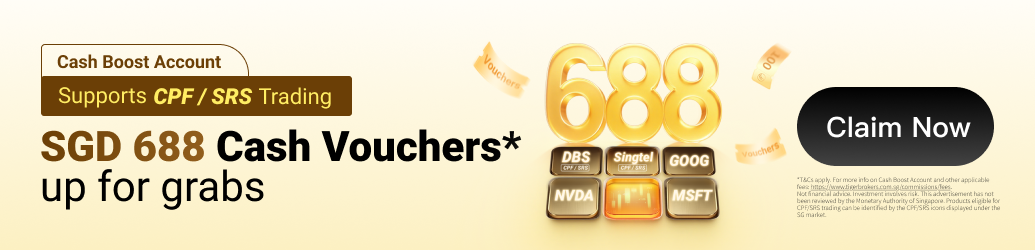 Complete your first Cash Boost Account trade with a trade amount of ≥ SGD 5000* to get SGD 688 stock vouchers*! The trade can be executed using any payment type available under the Cash Boost Account: Cash, CPF, SRS, or CDP.