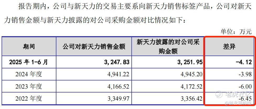 新天力披露数据显示,报告期内,其对江天科技的采购金额分别为3356.42万元、4172.52万元、4945.20万元和3251.95万元,与江天科技披露的数据分别存在6.45万元、6万元、3.98万元和4.12万元差异。