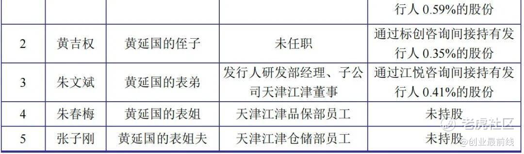 除此之外,黄延国的多位亲属也在江天科技任职。招股书显示,黄延国表弟朱文斌任江天科技研发部经理和子公司天津江津董事,表姐朱春梅任天津江津品保部员工,表姐夫任天津江津仓储部员工。