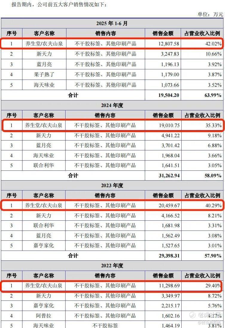 在经营上,公司通过向农夫山泉等知名品牌提供标签,实现了业绩持续增长。但在业绩增长背后,公司客户集中度较高,深度依赖大客户农夫山泉的问题突出。