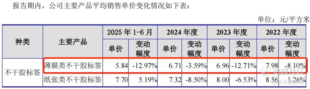 报告期内,薄膜类不干胶标签平均销售单价分别为7.98元/平方米、6.96元/平方米、6.71元/平方米和5.84元/平方米,变动幅度分别为-8.10%、-12.71%、-3.59%和-12.97%,持续下滑。