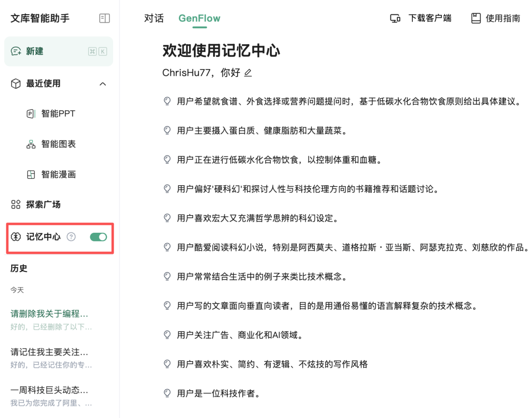 这个记忆中心会记录你和GenFlow交流过程中的关键信息,包括你主动喂给它的还有它在与你合作中自己领悟和识别到的,都会沉淀下来。