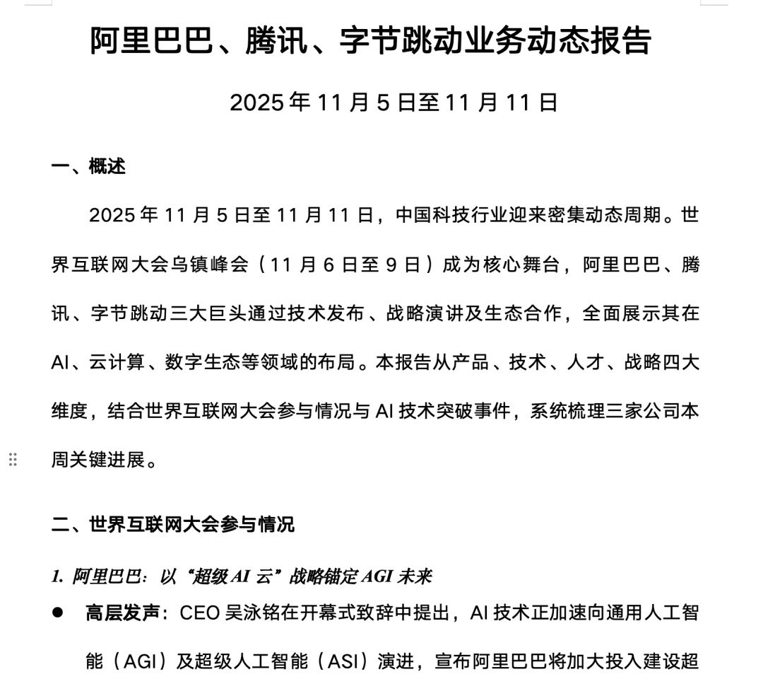 标题就是“阿里巴巴、腾讯、字节跳动业务动态报告(2025年11月5日至11月11日)”。