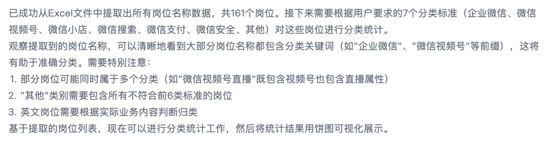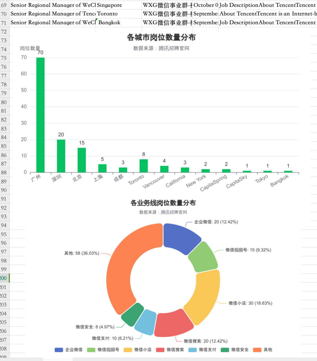 我试了试之前文章《微信正在忙什么——从招聘信息看微信战略战术背后的逻辑与细节》一文中提到过的腾讯招聘官网上下载的微信招聘岗位统计的Excel,并输入指令——