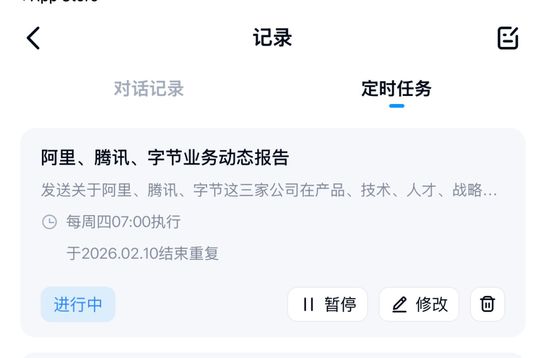 “请帮我创建一个定时任务,每周三晚上9点45分给我发一个关于阿里、腾讯、字节这三家公司业务动态的报告,报告需总结过去一周这三家公司在产品、技术、人才、战略等层面的重要新闻、动态。”