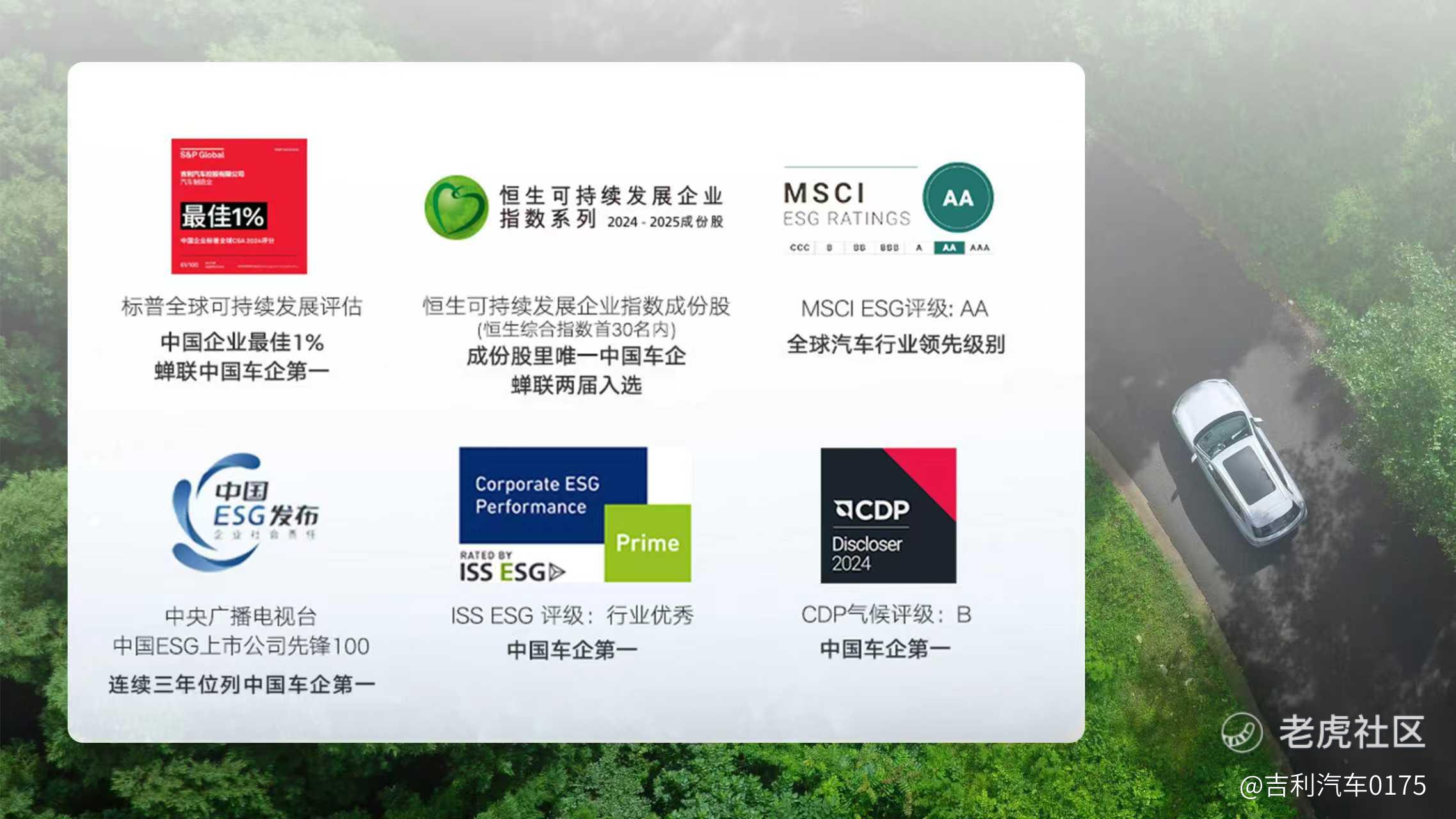 此外,吉利汽车的创新实力与可持续发展实践一直稳居中国车企ESG标杆地位,赢得了全球权威机构的高度认可:入选“中国ESG上市公司长三角先锋100(2025)”总榜单第一名、连续三年位列“中国ESG上市公司先锋100”榜单中国车企第一、连续三年获《财经》双碳领导力“卓越”评级、连续两年入选恒生可持续发展企业指数,还斩获2025年度财联社致远奖“环境友好(E)先锋企业奖”,国际权威机构MSCI ESG评级AA级,ISS ESG评级行业优秀、中国车企第一等多项殊荣,以亮眼成绩彰显中国汽车品牌的全球影响力。